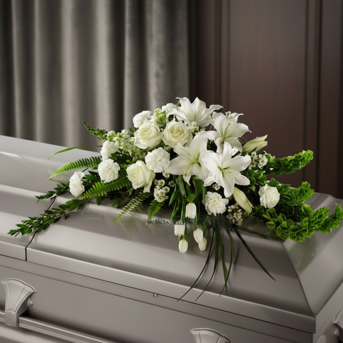 This beautiful Funeral Arrangement Covers Box is made with Lilies, Roses, Daisies and Green Foliage.