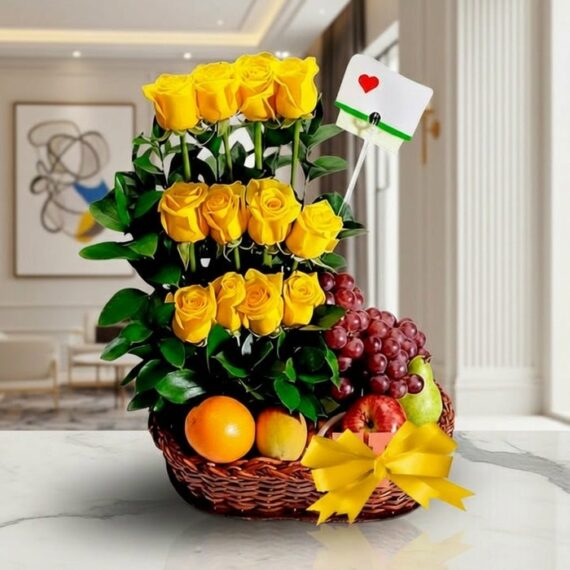 El arreglo Floral con Frutas paraíso, no importa la ocasión, sus diseños exclusivos.y saludables lo hacen el detalle perfecto, esta canasta se compone de: 12 Rosas Amarillas, Follajes verdes, 1 Ramillete de Uvas, 1 Pera, Durazno, Granadilla